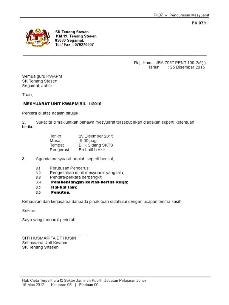 Contoh surat notis mesyuarat ahli jawatankuasa. Contoh surat panggilan mesyuarat kerajaan contoh surat. Pekerja sering lambat datang 3.4. Sekolah kebangsaan padang kubu 24010 kemaman, terengganu kepada : Download surat panggilan mesyuarat minit mesyuarat .